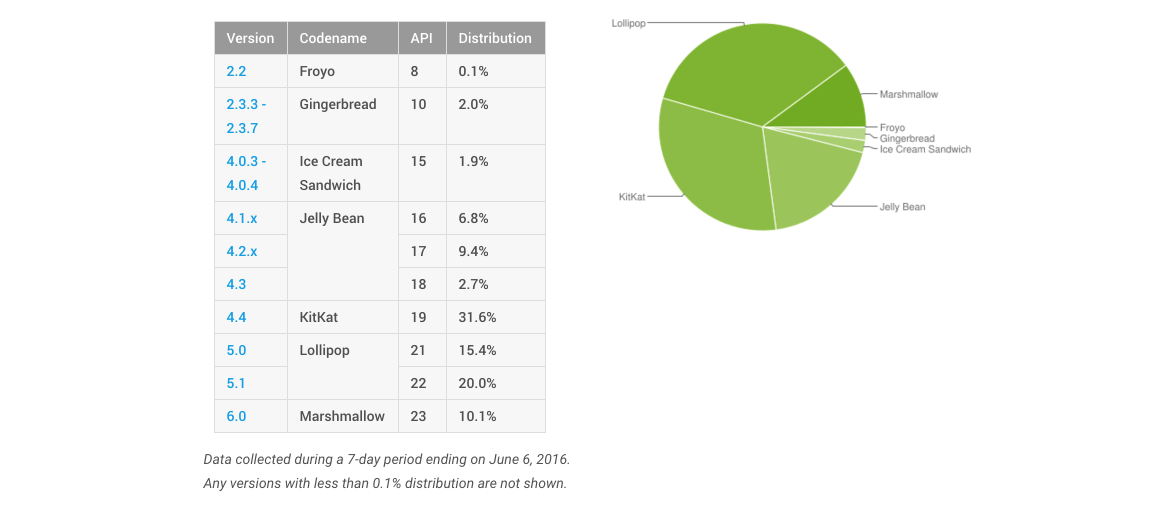 Das aktuelle Betriebssystem Android Marshmallow kommt auf einen Anteil von gerade einmal 10,1 Prozent – und das gute 8 Monate nachdem es auf dem Markt ist. Jeweils fast ein Drittel aller Nutzer ist noch mit der älteren Version Lollipop oder sogar KitKat unterwegs. Ein weiteres gutes Viertel setzt auf ein völlig veraltetes Betriebssystem. Selbst Froyo kommt noch auf einen Anteil von 0,1 Prozent und ist damit noch immer über der Wahrnehmungsgrenze und in der Liste enthalten.
