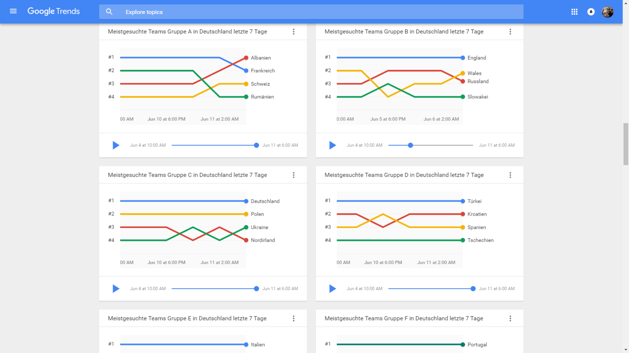 Auch die Google Trends bieten zu dem Turnier wieder umfangreiche Statistiken an, die auf den Suchanfragen der Nutzer der letzten Tage und Wochen basieren. Als erstes wird der meist-gegoogelte Spieler der letzten 24 Stunden gekürt – aktuell ist das Jonathan Tah – da er durch die späte Nachnominierung am meisten Interesse auf sich gezogen hat. Natürlich werden auch die beliebtesten Teams und Trainer gekürt. In einer weiteren Statistik gibt es einen Verlauf über die beliebtesten Mannschaften einer Gruppe.