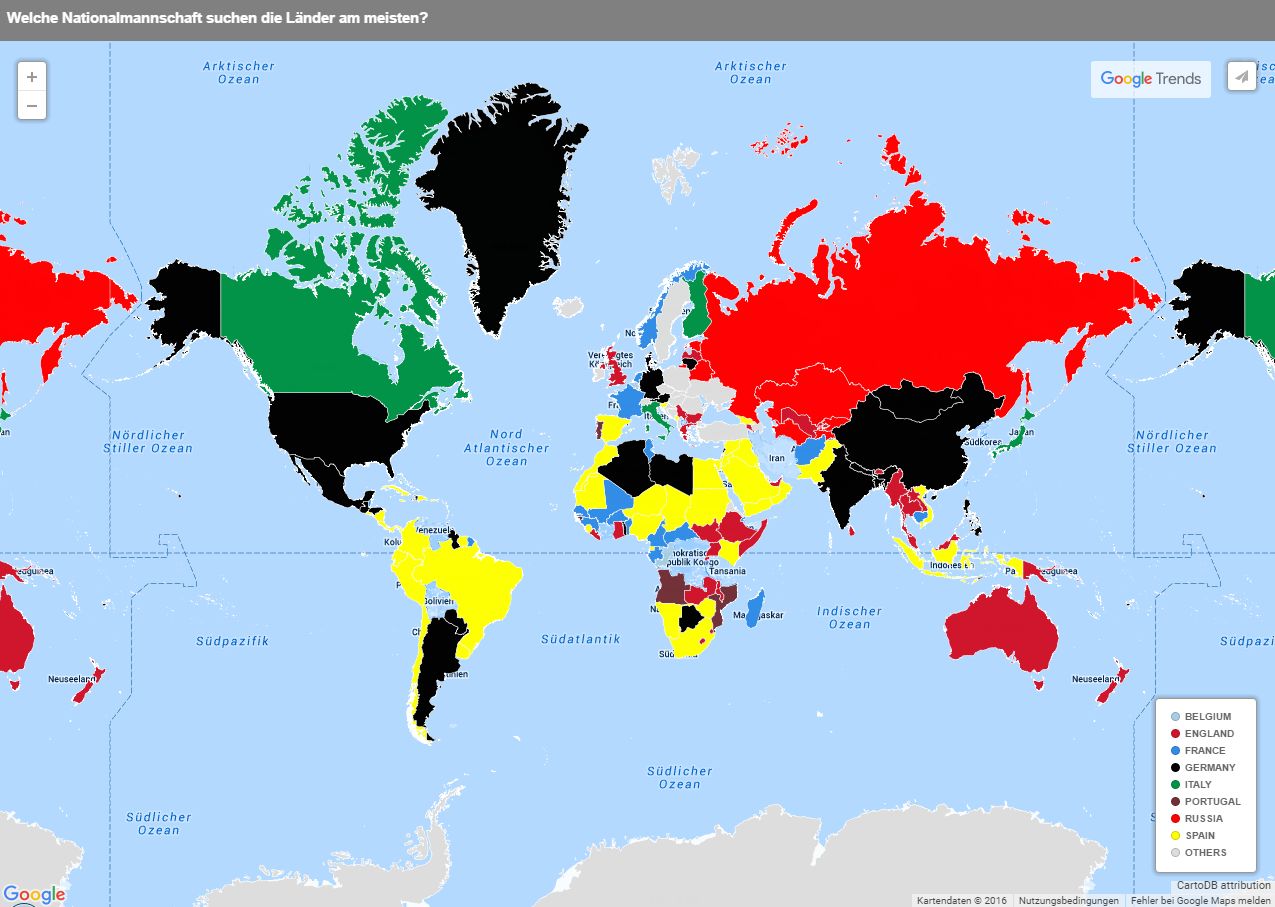 Auch spezielle Anfragen wie Fragen zum Alter und dem Lebenslauf von Joachim Löw finden sich in der Auflistung der Statistiken. Und so erfahren wir, dass die Menschen es interessant finden wo Joachim Löw Urlaub macht und wie lange die EM noch andauert. Wenig überraschend zeigt eine weitere Karte, dass das Interesse an der EM in Europa am größten ist. Neben einer weiteren Karte die das Interesse an den Mannschaften zeigt – Frankreich wird weltweit am meisten gesucht – gibt es auch noch eine Übersichtskarte über alle bekannten Public Viewing Hotspots in Deutschland.