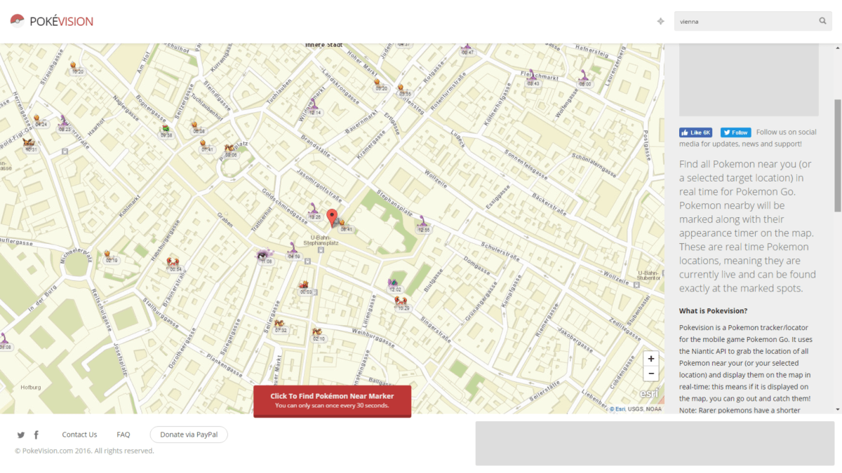 PokéVision kombiniert nun die Stärken der beiden anderen Plattformen und gleicht gleichzeitig deren Schwächen aus. Die Web-App besteht praktisch nur aus einer großen Google-Map, in der alle versteckten Pokémon weltweit angezeigt werden. Der Kartenausschnitt kann einfach verschoben oder nach einer bestimmten Adresse gesucht werden. Anschließend drückt man den Button zum Suchen und Anzeigen von Pokémon und schon wird der Kartenausschnitt aktualisiert und die aktuell zu findenden Taschenmonster angezeigt.