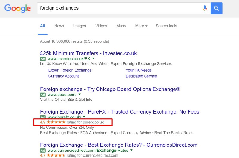 In einigen Werbeanzeigen befindet sich eine Bewertungsskala, die entweder die Webseite oder das dort beworbene Produkt bewirbt. Google kann diese Werte, so wie auch in den Ergebnissen der Websuche, auslesen und diese automatisch in das eigene Sterne-System umwandeln. Diese Sterne wurden bisher direkt unter der URL der Anzeige angezeigt und waren durch die gelbe Farbe ein guter Eyecatcher, der sich vom Rest der Anzeige abgehoben hat.