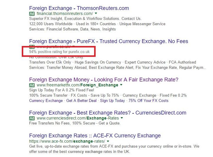 Doch jetzt testet man eine alternative Darstellung, bei der die Sterne durch einen simplen Text ersetzt werden. Dieser ist in grau gehalten und zeigt den genauen Prozentwert der Bewertung an. Sowohl durch die Farbe als auch durch die Tatsache dass es sich um Text-in-Text handelt fällt die Bewertung nun überhaupt nicht mehr auf und verschafft der Anzeige so keinen Vorteil mehr gegenüber einer Anzeige ohne Sternebewertung.