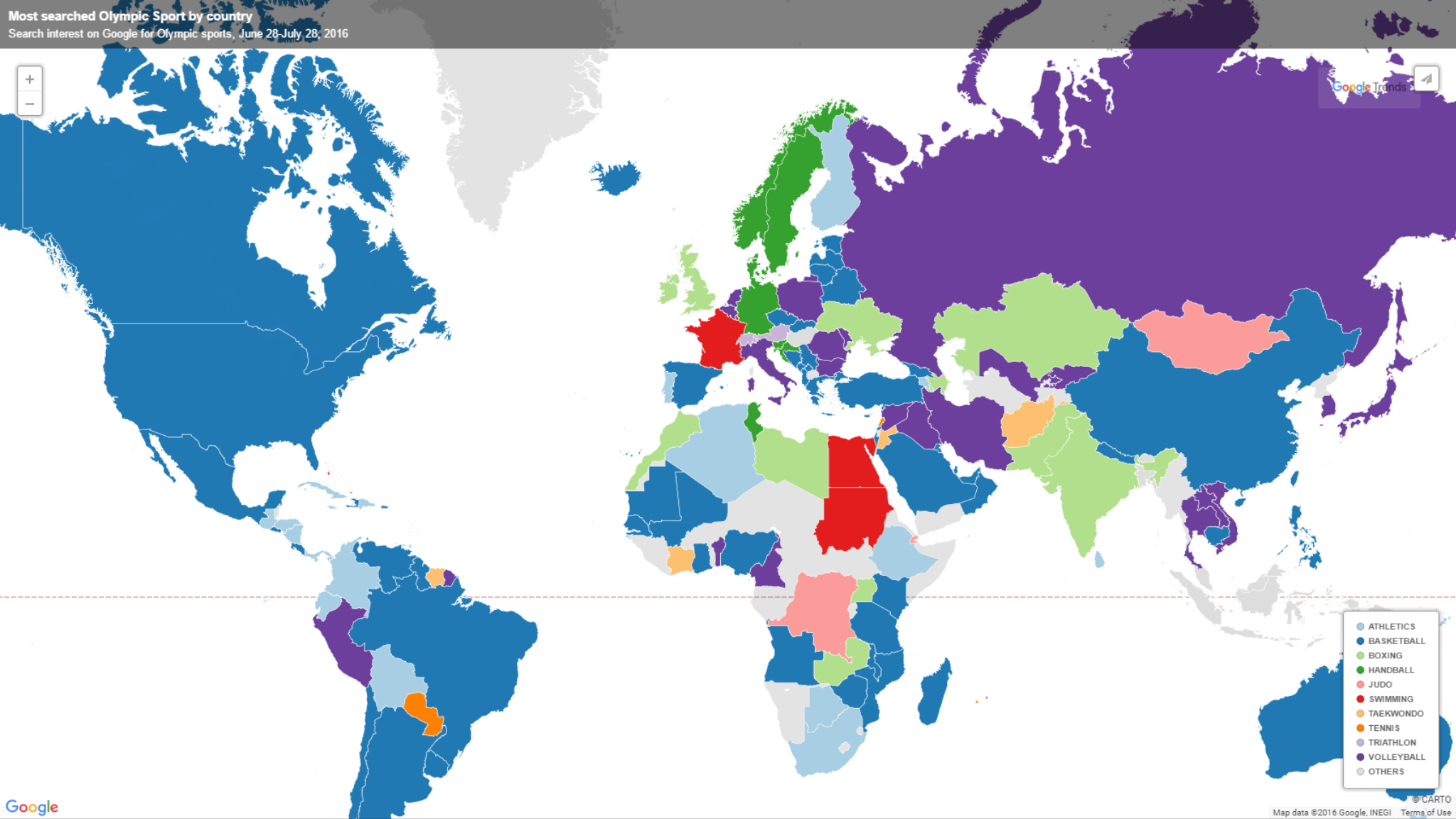 Auf einer großen Karte lässt sich anzeigen, in welchem Land das Interesse nach welchen Sportarten am höchsten ist, wobei Basketball mit Abstand am beliebtesten ist – was wohl auch daran liegt dass diese Sportart auch außerhalb der Spiele sehr interessant und beliebt ist. In weiteren Statistiken ist auch zu sehen, welche Athleten und welche Sportarten weltweit am beliebtesten sind und zu den Aufsteigern dieser Spiele gehören.