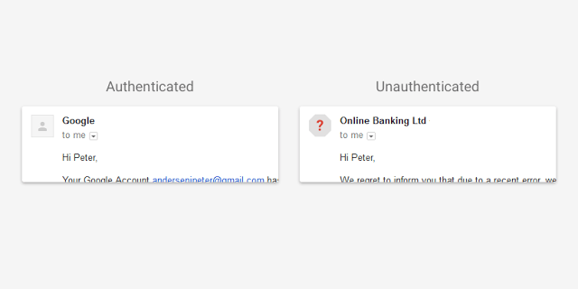 Sowohl die Web-Version als auch die GMail-App kann dem Nutzer nun anzeigen, ob der Absender authentifiziert werden konnte oder nicht. GMail verwendet dabei sowohl die SPF- als auch die DKIM-Technologie und ist somit für beide Standards gerüstet. Wenn der Absender nicht eindeutig bestätigt werden kann, wird statt dem Avatar oder dem Anfangsbuchstaben jetzt ein Fragezeichen angezeigt.