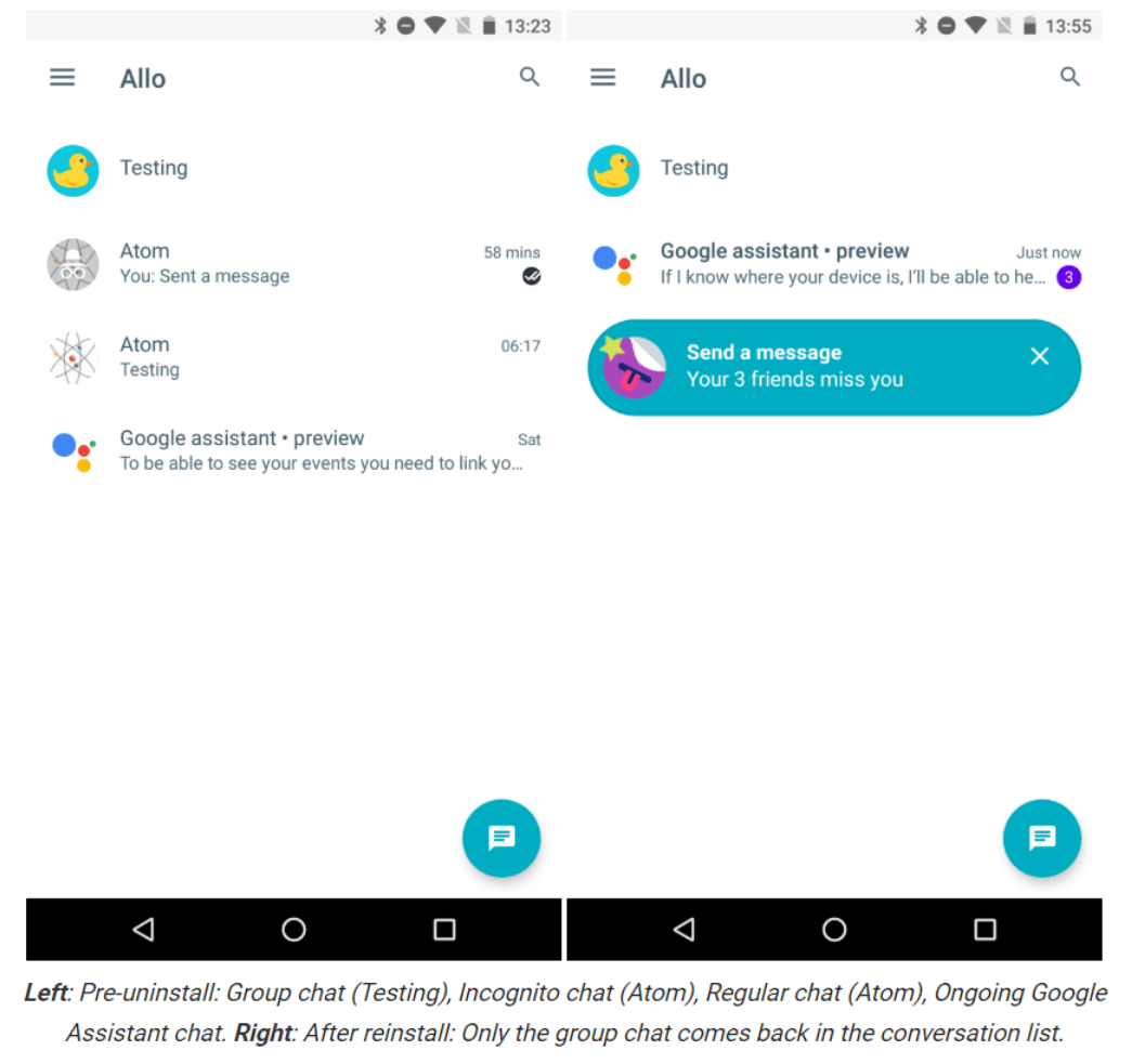 Das einzige was erhalten bleibt, sind die über Allo empfangenen Bilddateien. Allerdings sind auch diese nicht mehr an eine bestimmte Konversation gebunden, da ja alle Chatverläufe verschwunden sind. Außerdem bleibt die Zugehörigkeit zu einem Gruppenchat erhalten, man fliegt aus diesen also nicht komplett heraus.