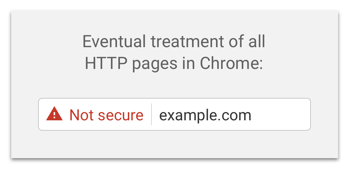Obiger Screenshot zeigt, wie diese Warnung schon in wenigen Monaten aussehen wird. Direkt vor der URL wird ein Label mit der Beschriftung „Not secure“ angezeigt. Zwar werden noch keine großen Gefahrenzeichen angezeigt, aber allein die beiden Worte dürften schon dafür sorgen, dass die Nutzer ins Grübeln kommen – wenn sie diese denn sehen. In einem späteren Schritt könnte die Optik dieser Meldung auch noch einmal verschärft werden und in roter Farbe sowie mit einem Warn-Icon versehen werden, so wie folgende Grafik zeigt.