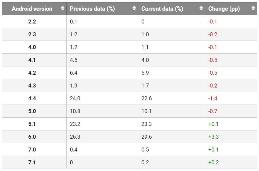 Die beiden dominierenden Versionen sind nach wie vor Lollipop mit 33, Prozent und Marshmallow mit 29,6 Prozent. Aber auch der Vorgänger KitKat ist noch weit verbreitet und kommt auf 22,6 Prozent Anteil. Nennenswert ist auch noch Jelly Bean mit einem Anteil von knapp über 10 Prozent. Die aktuellen beiden Versionen von Android Nougat kommen kombiniert auf weniger als 1 Prozent. 7.0 kommt auf 0,5 Prozent und das brandaktuelle 7.1 kommt immerhin schon auf 0,2 Prozent.