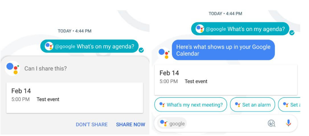 Erlaubt man dem Assistant das Teilen dieser Information, wird diese als Nachricht direkt in den aktiven Gruppenchat gesendet. Dadurch können dann auch alle anderen in dem selben Chat befindlichen Nutzer den anstehenden Termin sehen. Bisher musste man dafür noch einmal selbst anlegen und die Antwort des Assistant kopieren oder abtippen. Ein automatisches Teilen bzw. einen ständigen Zugriff gibt es aber natürlich nicht. Das Teilen wird lediglich das eine mal für diese explizite Antwort erlaubt.