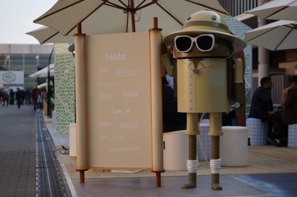 Da bis auf wenige Ausnahmen alle auf dem MWC vorgestellten Smartphones und auch viele Smartwatches mit dem Betriebssystem Android ausgestattet sind, ist auch Google vor Ort und promotet sein Betriebssystem an allen Ecken und Enden. Überall auf dem Gelände sind Android-Figuren in allen Größen, Formen und Farben zu finden und der riesige Bereich, der sich vollständig im Freien vor der Halle befindet, ist mit vielen Demo-Ständen und mehr gefüllt.