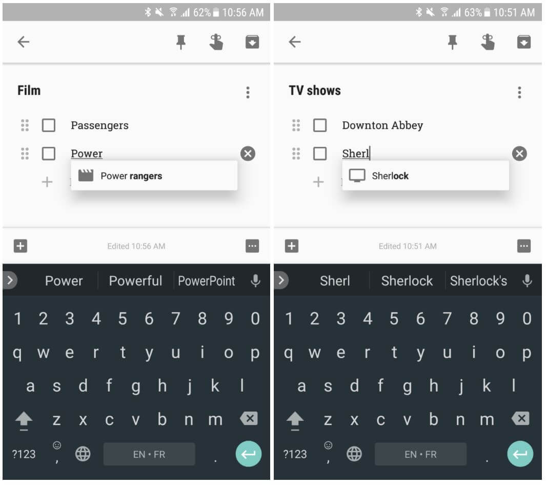 Wird eine Liste mit Filmtiteln oder Serientiteln erstellt, kann Keep dies nun erkennen und automatisch während der Eingabe Vorschläge unterbreiten. Das ganze funktioniert allerdings nur dann, wenn die Liste sehr eindeutig erkannt wird. Das kann entweder durch die Verwendung des Titels „Movies“ oder einem ähnlichen Wort angezeigt werden, oder wenn die Liste selbst schon einige Einträge aus der Filmwelt enthält. Die Vorschläge unterscheiden sich durch Icons und weisen darauf hin, ob es sich um einen Film oder eine Serie handelt.