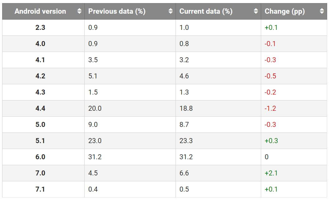 Wie die obigen Zahlen zeigen sind auch im Mai die beiden Versionen Lollipop und Marshmallow die dominierenden Betriebssysteme und kommen auf einen Anteil von 32 Prozent bzw. 31,2 Prozent. Beide Betriebssysteme treten dabei auf der Stelle und konnten ihren Anteil weder steigern noch senken. Marshmallow ist genau gleich geblieben und bei Lollipop hat die Version 5.0 0,3 Prozent verloren und die folgende Version 5.1 hat 0,3 Prozent gewonnen. Erst darüber und darunter gibt es einige Veränderungen.
