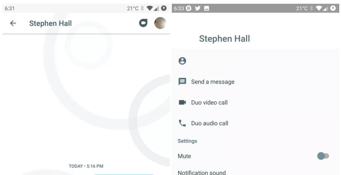 Direkt in der Einzelansicht eines Allo-Chats wird es schon bald zwei Buttons am oberen Rand geben, mit denen Audio- oder Video-Anrufe zwischen den beiden Kontakten getätigt werden können. Dazu wird Duo zum Einsatz kommen, was sich aus der Beschriftung der Buttons „Duo Audio Call“ und „Duo Video Call“ ergibt. Ob mit diesen Buttons direkt ein Anruf gestartet wird oder nur die App geöffnet wird lässt sich nicht sagen, aber es ist ein erster Schritt hin zur Nutzung nur noch einer einzigen App.