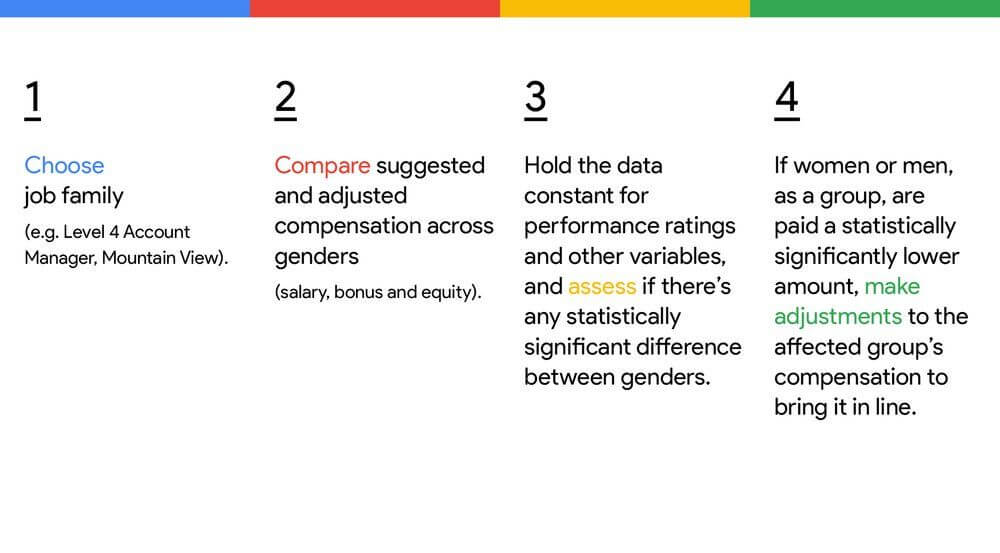 Um die Vorwürfe weiter zu entkräften hatte Google einen internen Ablauf-Plan für die Festlegung des Gehalts veröffentlicht, aus dem hervorgehen soll dass es im Unternehmen gar nicht möglich ist, Mitarbeitern weniger zu bezahlen als den Kollegen – völlig unabhängig vom Geschlecht. Doch dieser Plan wurde vor allem dafür kritisiert, dass am Ende doch die direkten Vorgesetzten mitreden und so die Leistungen der männlichen Mitarbeiter besser bewerten könnten als die der weiblichen – womit am Ende auch das beste System nichts nützt, wenn vor allem Bonuszahlungen einen großen Teil des Gehalts ausmachen.