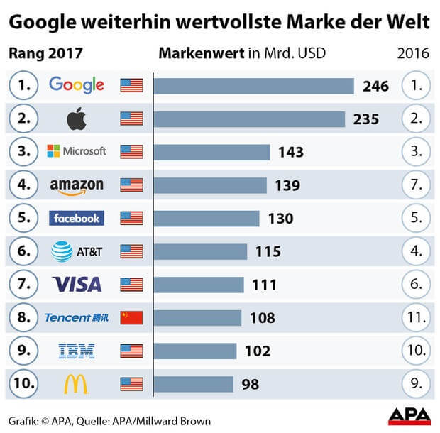 BrandZ 2017: Google ist mit 246 Milliarden Dollar die wertvollste Marke der Welt
