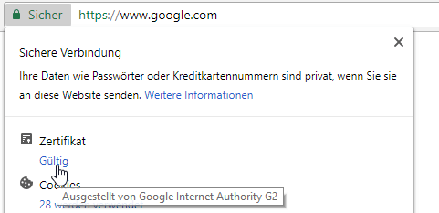 Die Option steht auf Windows, Linux, Mac und Chrome OS zur Verfügung. Der Link „Gültig“ bzw. „ungültig“ (etwa bei selbst-signierten Zertifikaten) öffnet das alte Fenster, welches das Zertifikat im Detail anzeigt.
