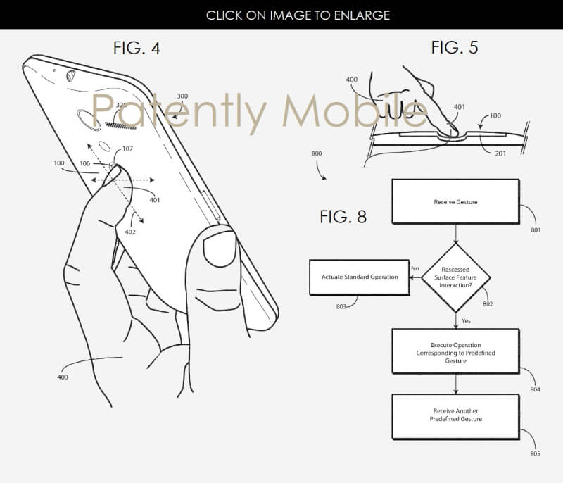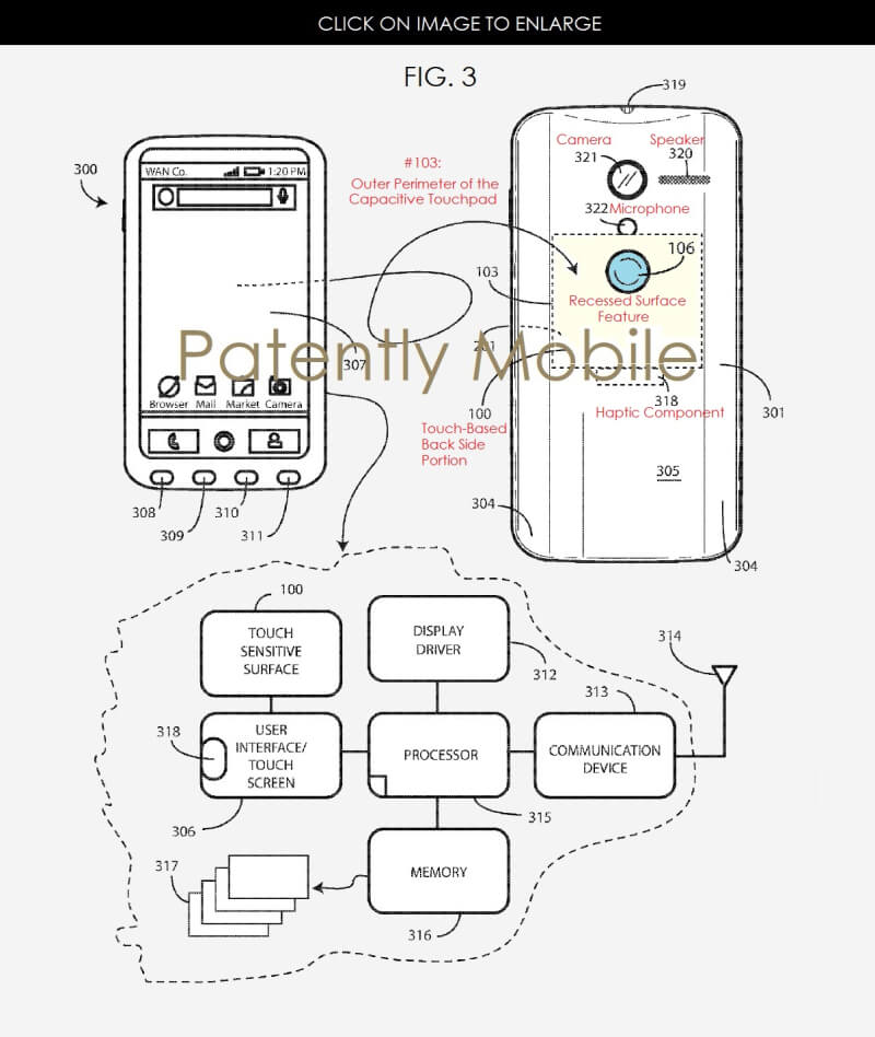 Das Patent beschreibt eine Touch-sensitive Oberfläche auf der Rückseite eines Smartphones. Diese soll sich laut Konzept unter allen weiteren dort untergebrachten Dingen wie dem Fingerabdrucksensor und auch der Kamera befinden und so bequem mit dem Zeigefinger erreichbar sein. Die Fläche soll wie ein Touchpad funktionieren und auf passende Gesten reagieren und dadurch Aktionen ausführen können. Durch einen Wisch in eine bestimmte Richtung oder eine eindeutige andere Geste könnten etwa Musiktitel gewechselt, die Lautstärke eingestellt oder auch Apps wie die Taschenlampe gestartet werden.