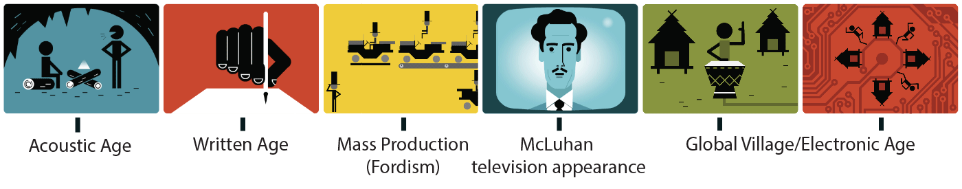 Das Doodle zeigt teilweise die einzelnen Abschnitte, in die der Philosoph und Medientheoretiker die Geschichte der Menschheit eingeteilt hat – allerdings in einer abgewandelten Form. McLuhan teilte die Geschichte in die vier Phasen Akustik-Zeitalter, das dichterische Zeitalter, das Druck-Zeitalter und das elektronische Zeitalter. Im Doodle sind noch einige andere Dinge zu sehen, die mit dieser Phase zwar nichts zu tun haben, aber die Menschheit ebenfalls entscheidend vorangebracht haben: Die Massenproduktion und das Fernsehen sowie das Internet („Globales Dorf“).