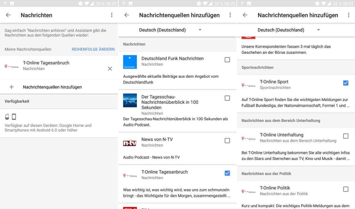 In den Einstellungen gibt es nun die beiden neuen Einträge „Nachrichten“ und „Mein Tag“, die nun komplett lokalisiert sind. Mit der Nachrichten-Funktion kann man sich vom Assistenten die wichtigsten Schlagzeilen des Tages bzw. der Nacht vorlesen lassen. Dazu reicht einfach nur der Befehl „Nachrichten anhören“, und schon werden die Titel vorgelesen. Standardmäßig sind einige Quellen bereits eingerichtet, aber man kann diese in den Einstellungen noch weiter anpassen.