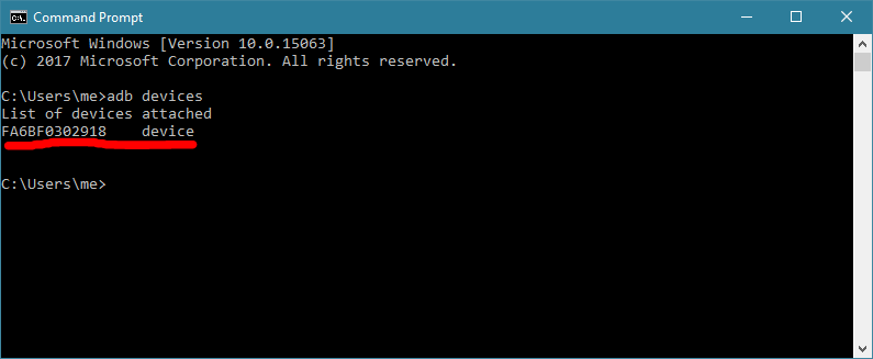 - Gebt den Befehl „adb devices“ ein, dann sollte das Gerät aufgeführt werden