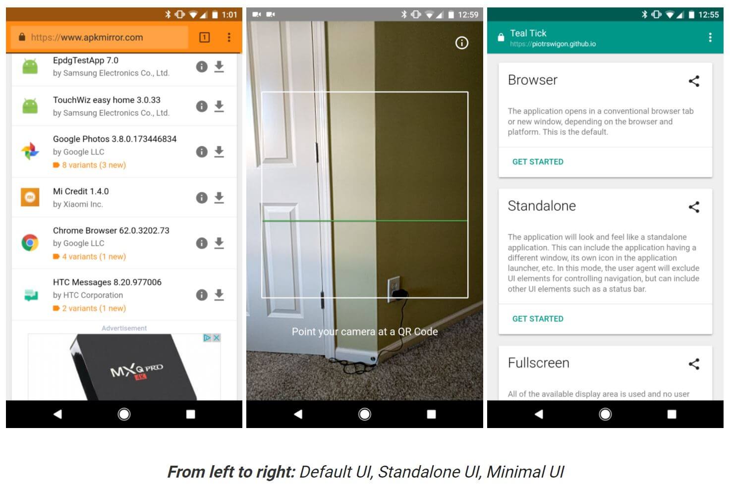Jede Webseite lässt sich über eine Verknüpfung auf dem Homescreen als Web App einrichten, die dann direkt wieder im Browser geöffnet wird. Über eine eventuell vorhandene Manifest-Datei kann können Web-Entwickler nun festlegen, wie sie ihre App gerne geöffnet hätten. Dabei hatte man bisher die Wahl zwischen dem normalen Browser-Fenster und dem Vollbild, und jetzt kommt eine dritte Variante dazu, die ihr ganz rechts auf dem Screenshot sehen könnt.