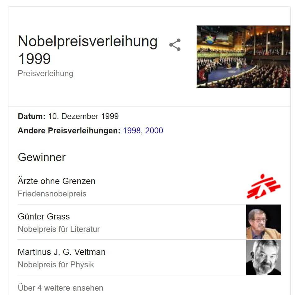 Leider zeigt die Websuche nicht an, wofür die Person oder die Gruppe von Personen den Preis genau bekommen hat, sondern lediglich die Kategorie. Erst mit einem Klick auf den Namen erfährt man dann mehr über die Person, muss dann aber in den meisten Fällen doch noch zur Wikipedia oder einer anderen Webseite wechseln, um zu wissen, worum es überhaupt ging.