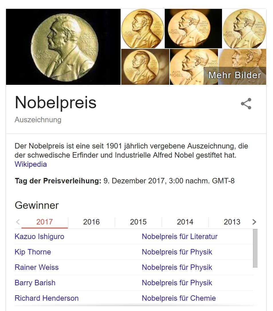 Bei der Eingabe der Suchanfrage Nobelpreis erhält man nicht nur die entsprechenden Webseiten und die News am oberen Rand, sondern natürlich auch den Knowledge Graph mit der Erklärung dieser Preisverleihung und des Preises selbst. Zusätzlich gibt es eine Auflistung der Gewinner, der nach Jahren sortiert sehr genau anzeigt, wer welchen Preis gewonnen hat. Die Daten sind einigermaßen Live aktualisiert, so dass sie schon nach wenigen Stunden wieder auf dem neuesten Stand sind.