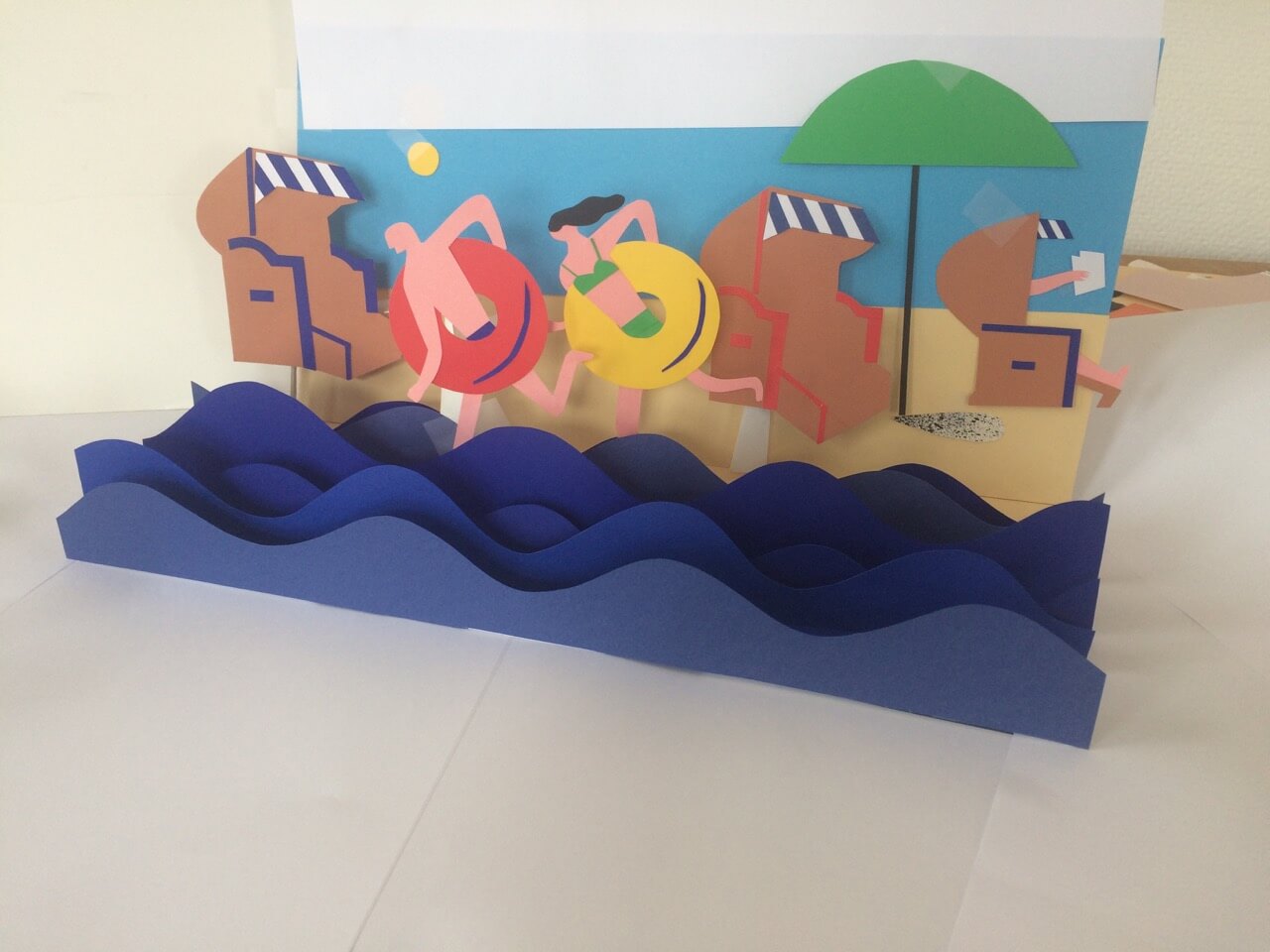 Obige Skulptur wurde schlicht und einfach aus farbigem Papier gebastelt und anschließend ausgeschnitten und in Form gebracht. Durch die Aufteilung in einzelne Ebenen und natürlich auch durch den leicht schrägen Winkel des Fotos entsteht ein sehr plastischer und 3-dimensionaler Eindruck. Ob die restlichen Figuren und kleinen Farbänderungen der dann per Computer oder tatsächlich im echten Papiermodell hinzugefügt worden sind, lässt sich leider nicht sagen und wird auch in der Doodle-Beschreibung nicht erwähnt.