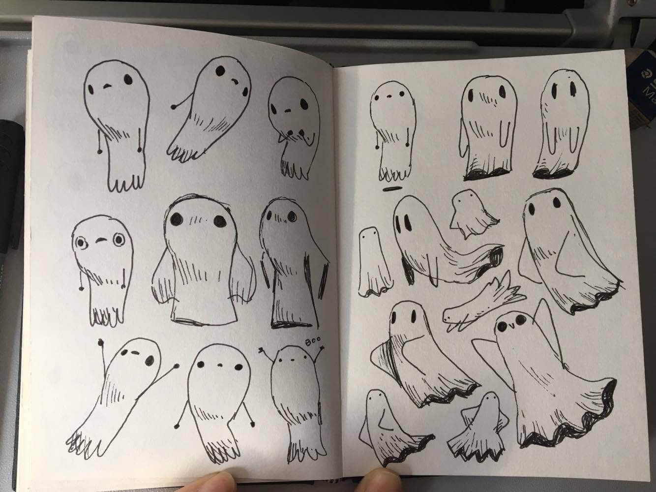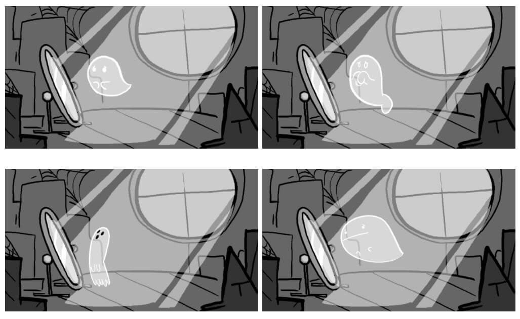 Auf obigem Bild sein viele verschiedene Entwürfe für den Geist Jinx zu sehen. Man kann sich kaum vorstellen, dass es für einen simplen Geist mit der bekannten Bettlaken-Optik so viele verschiedene Versionen geben kann. Auch im folgenden Bild, das im Archiv animiert ist, aber hier aus Performance-Gründen nur als Screenshot eingebunden ist.