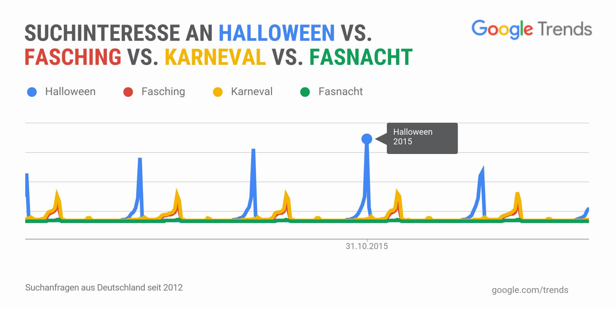Suchinteresse in Deutschland zu Halloween verglichen zu Fasching, Karneval und Fasnacht