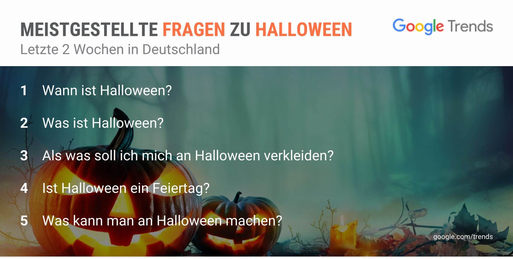 In genau fünf Tagen steht wieder Halloween vor der Tür, und natürlich steigen dadurch auch wieder die Suchanfragen zu diesem Thema extrem an. Einen ersten Blick auf die Such-Statistiken rund um Halloween haben wir bereits veröffentlicht, und jetzt hat auch Google offiziell eine aufbereite Liste zusammengestellt, die wir euch natürlich nicht vorenthalten wollen.