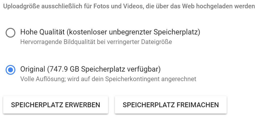 Und selbst wenn einem die „Hohe Qualität“ nicht ausreicht und der Speicherplatz langsam zur Neige geht, kann man noch immer sehr günstig Speicherplatz bei Google nachkaufen, der dann eine sehr lange Zeit hält.