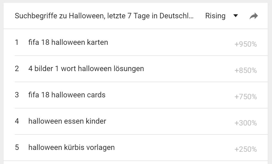 Zur Vollständigkeit, und Verteidigung, hier noch einmal das Widget mit der Topliste, in denen wieder die klassischen Themen vorkommen, und die nicht ganz so stark vom Merchandising geprägt ist. Hier kommen dann wieder die klassischen Anfragen zum Schminken, dem passenden Essen, Partys oder dem Kürbis vor.