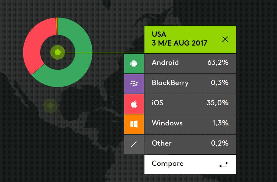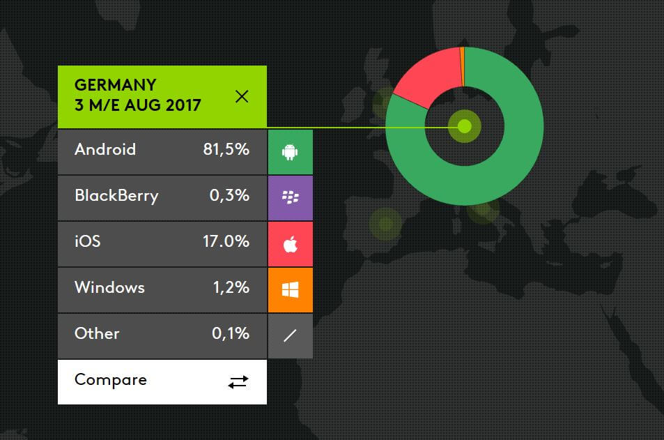 Über die Jahre hat sich Android immer mehr Marktanteile von iOS abgeknabbert und ist schon vor langer Zeit auf und davon gezogen. Je nach Land und Statistik kommt Android auf einen vier- bis fünfmal so hohen Anteil wie das Betriebssystem aus dem Hause Apple. Während es aber bis vor kurzem noch Windows Phone bzw. Windows Mobile gab, das ja bekanntlich in sich zusammengefallen ist, teilen sich beide den Markt nun untereinander auf.