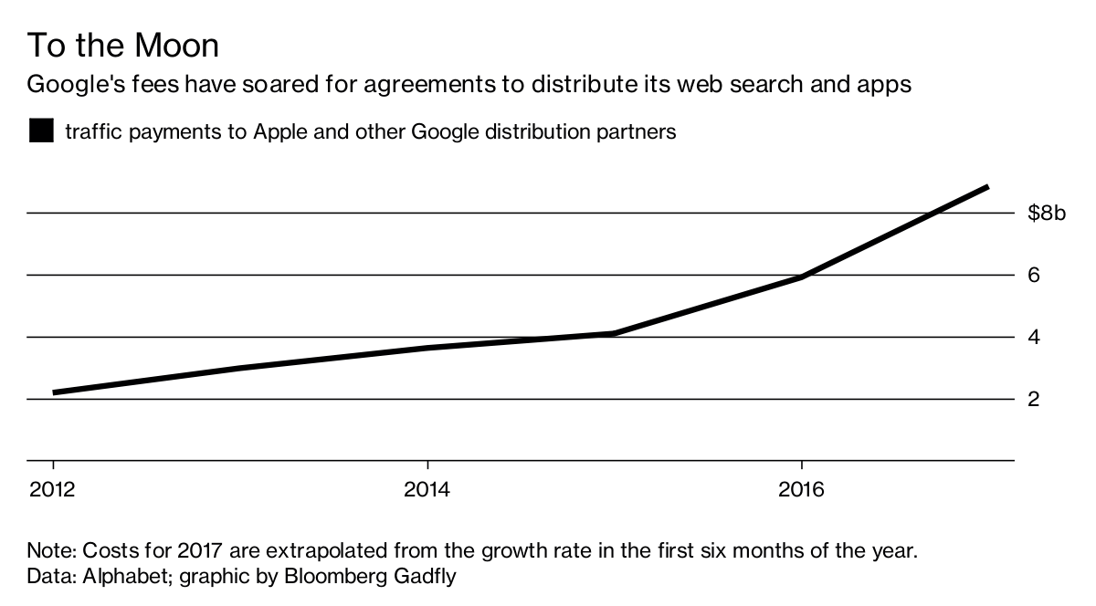 Laut Analysten hat Google allein im vergangenen Jahr 19 Milliarden Dollar zum Einkauf von Traffic ausgegeben – die sogenannten Traffic Acquisition Cost (TAC). Ein großer Teil davon ist an die Smartphone-Hersteller geflossen, damit sie Google auch weiterhin als Standard einstellen und prominent auf dem Homescreen platzieren. Allein Apple lässt sich das nun mit 3 Milliarden Dollar pro Jahr bezahlen und Samsung fordert sogar ganze 3,5 Milliarde Dollar pro Jahr – und auch die anderen Hersteller und Browser-Entwickler dürften es nicht mehr nur aus Nächstenliebe machen.