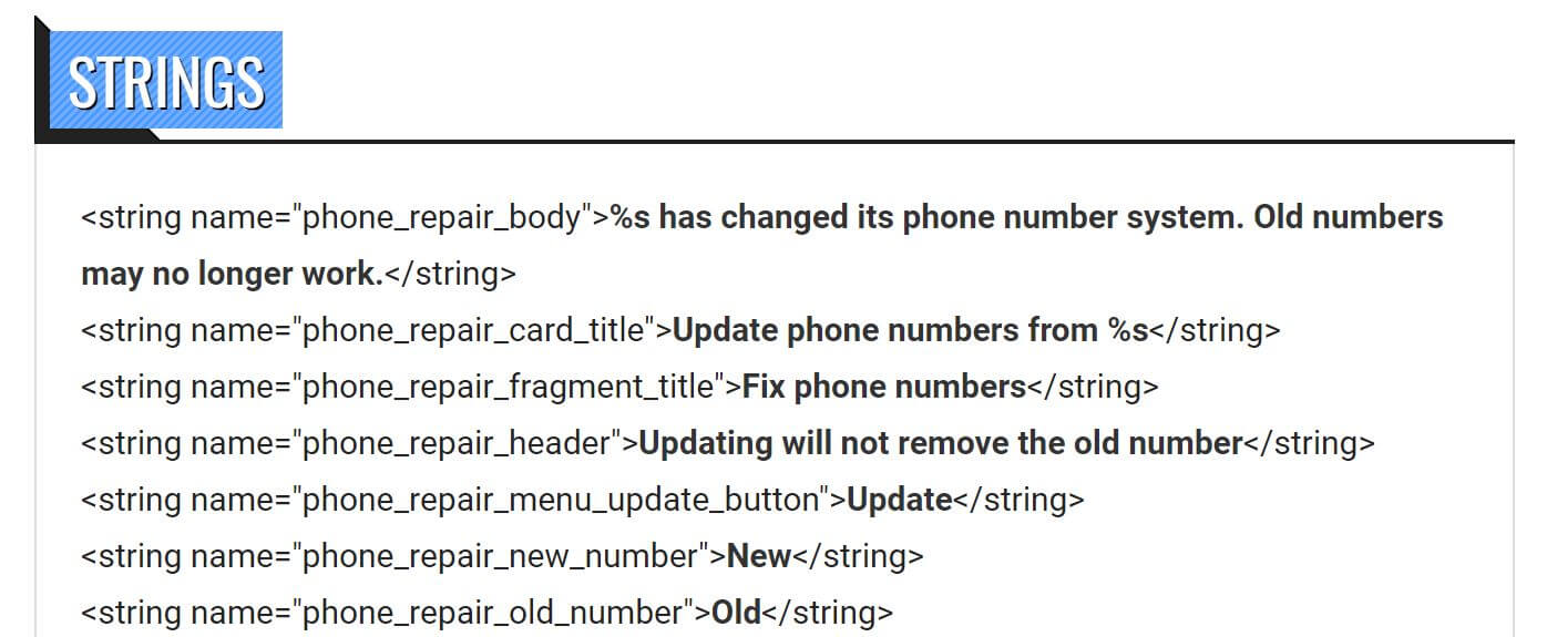 Die zweite Entdeckung im Teardown bezieht sich auf die Telefonnummer des Nutzers. Eine fehlerhafte Nummer soll nun von Contacts erkannt und automatisch korrigiert werden. Leider geht aus der Beschreibung nicht hervor, wie das ganze genau funktionieren soll. Insbesondere die erste Zeile zum Wechsel des „phone number system“ ist interessant, lässt aber keinen Rückschluss auf die eigentliche Funktion zu. Dabei kann es sich aber nicht nur um die Darstellung handeln, denn laut den Texten sollen die alten Nummern möglicherweise nicht mehr funktionieren.