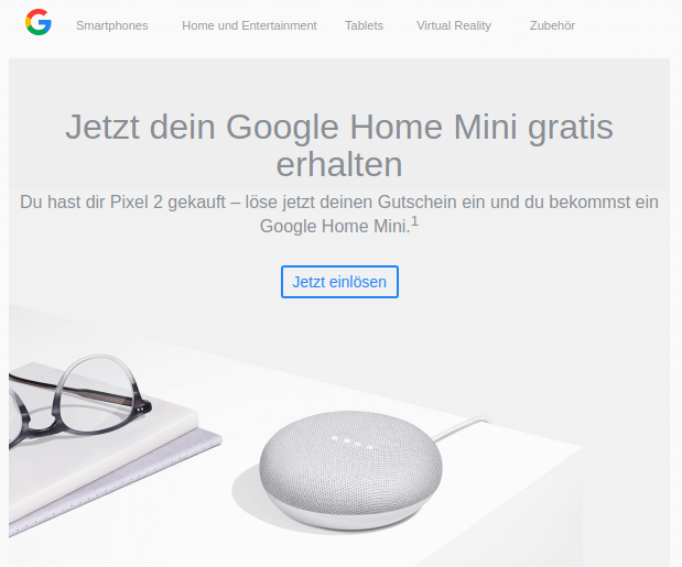Bereits am 4. Oktober hatte ich mir das Pixel gekauft und es wurde am 17. Oktober verschickt. Heute Nacht habe ich und auch andere Leser, die ebenfalls als eine der ersten bestellt haben, den Gutscheincode für den Home Mini erhalten.