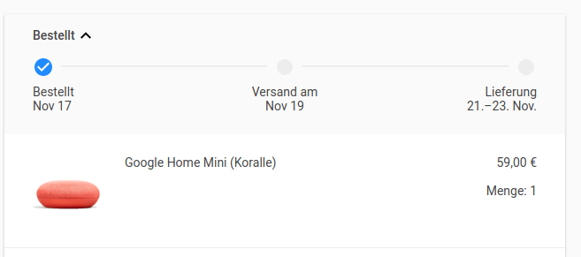 Ich hatte mein Pixel 2 auch vorbestellt und es wurde am 17.10. verschickt. Heute Nacht hatte ich dann die besagte E-Mail von Google, der Google home mini soll Mitte nächster Woche bei mir sein.