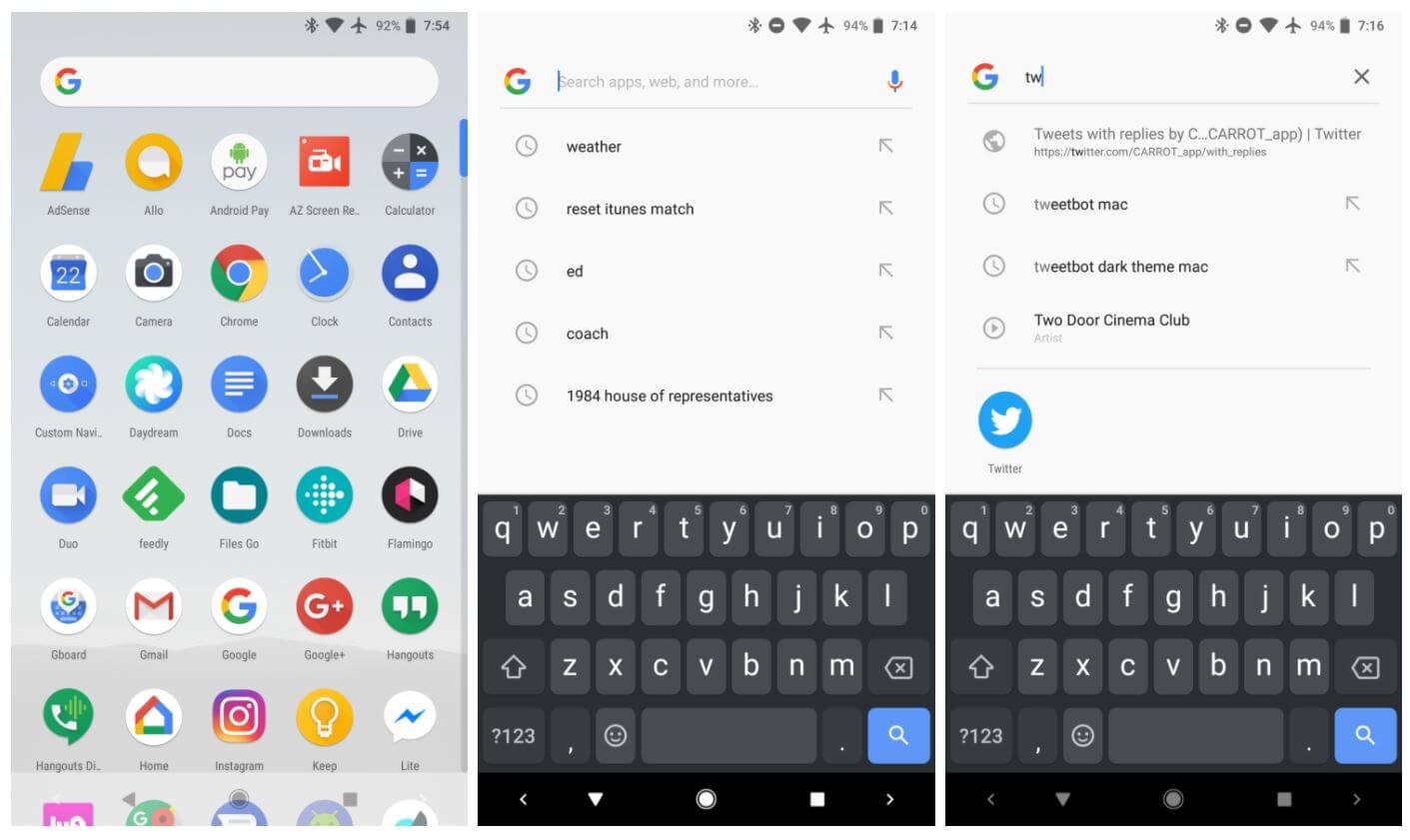 Wer die Developer Preview nutzt, bekommt nun automatisch den neuen Launcher auf sein Pixel-Smartphone. Wer an der Preview nicht teilnimmt, muss sich einfach noch einige Wochen oder Monate gedulden, bis Android 8.1 Oreo stabil wird. Zu den neuen Features gehört neben der auffälligsten Veränderung, nämlich die Suchleiste am unteren Rand, auch der obere neue Bereich mit dem Datum, dem Wetter und den anstehenden Terminen. Außerdem ist die Suchfunktion im App Drawer nun überarbeitet worden und fungiert nicht mehr nur als Filter für diese Liste, sondern ist ein vollständiges Suchfeld aus der Websuche inklusive Vorschlägen und zuletzt abgegebenen Suchanfragen.