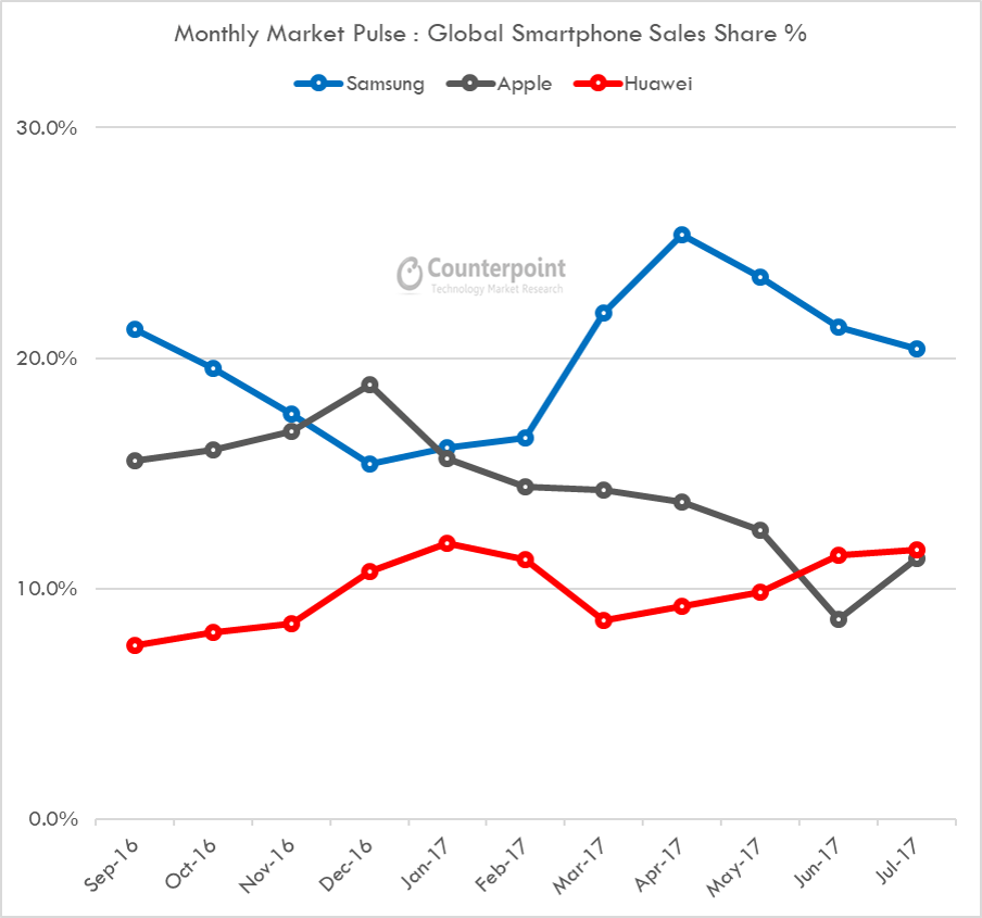 Die Zahlen decken sich ungefähr mit den letzten Zahlen zu den Anteilen der Betriebssysteme, denn auch dabei kam Apple auf gute 12 Prozent und Android folglich auf fast den gesamten Rest des Marktes. Apple hat aber noch einmal die Kurve bekommen und kann sich auch in diesem Quartal auf dem zweiten Platz halten. Wie obige Grafik zeigt, ist gerade in der Spitze sehr viel Bewegung drin – obwohl die Abstände derzeit doch recht groß wirken.