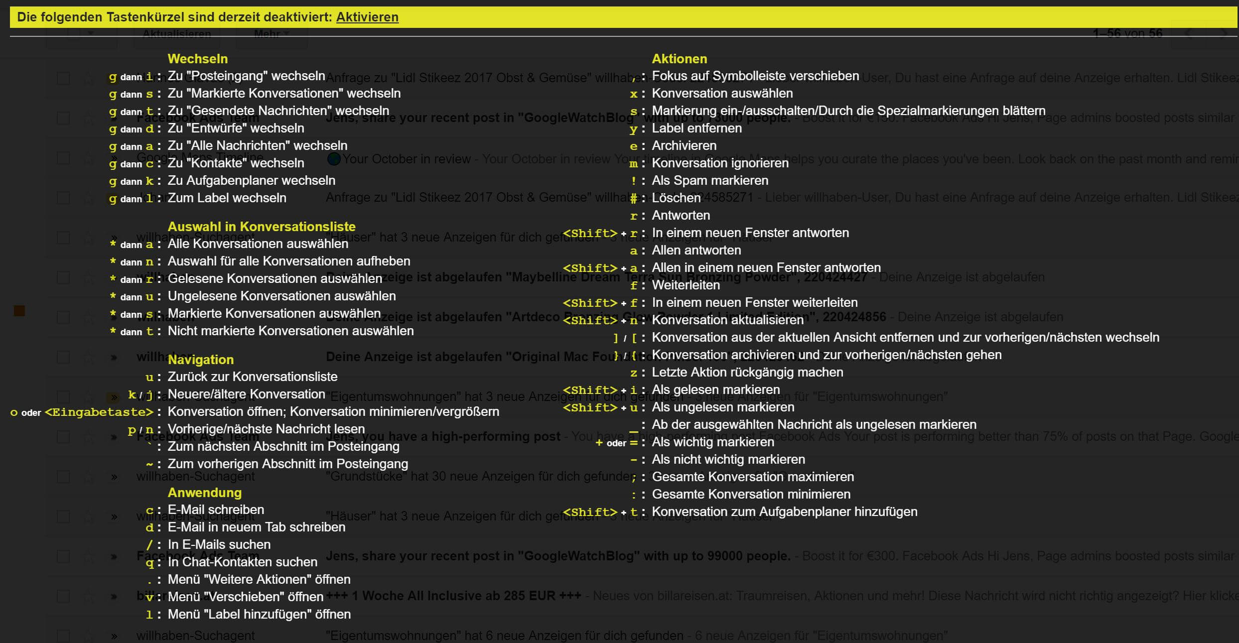 Es gibt aber noch eine ganze Reihe weiterer Tastenkürzel, die standardmäßig nicht aktiviert sind und erst über die Einstellungen oder das Popup freigeschaltet werden müssen. Das liegt vor allem daran, dass hier sehr oft nur einzelne Tasten und keine Kombinationen zum Einsatz kommen, die man auch mal versehentlich drücke kann. Hat man das erst einmal aktiviert, kann man die einzelnen Bereiche innerhalb von GMail wechseln, einzelne Konversationen auswählen, bestimmte Aktionen starten und E-Mails organisieren.