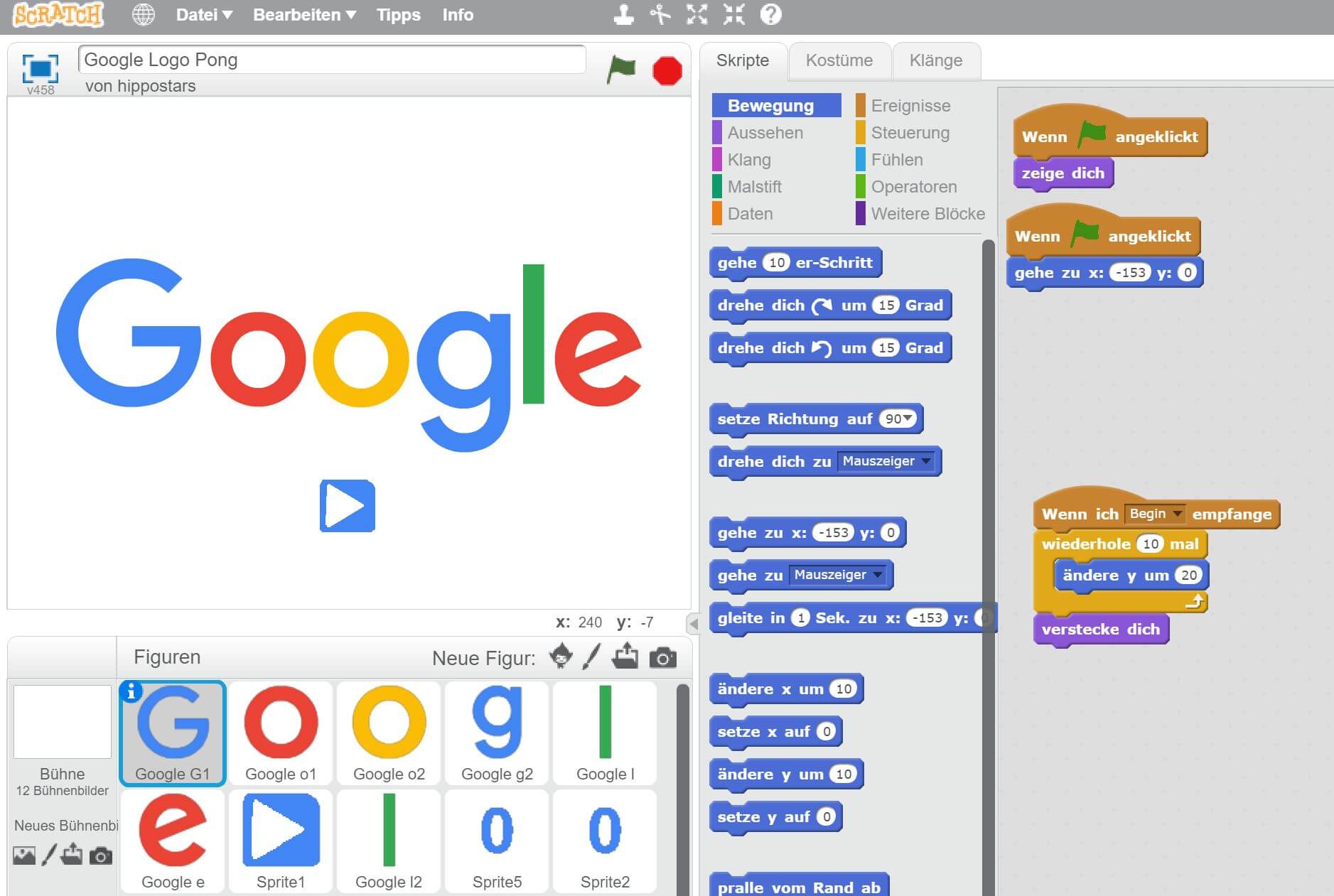 Mit Scratch und CS First hat Google in Zusammenarbeit mit dem MIT eine neue Plattform geschaffen, in der jeder kinderleicht Abläufe erstellen und Animationen programmieren kann – und das alles ganz leicht per Drag & Drop und mit vielen verschiedenen Schaltern und Abläufen. Grundlegend geht es darum, dass man mit dem Google-Logo und dessen 6 Buchstaben startet, und mit diesen interagieren kann. Zusätzlich können auch noch beliebige weitere Elemente aus einer großen Datenbank hinzugefügt oder auch aus dem Web eingefügt oder gar selbst gezeichnet werden.