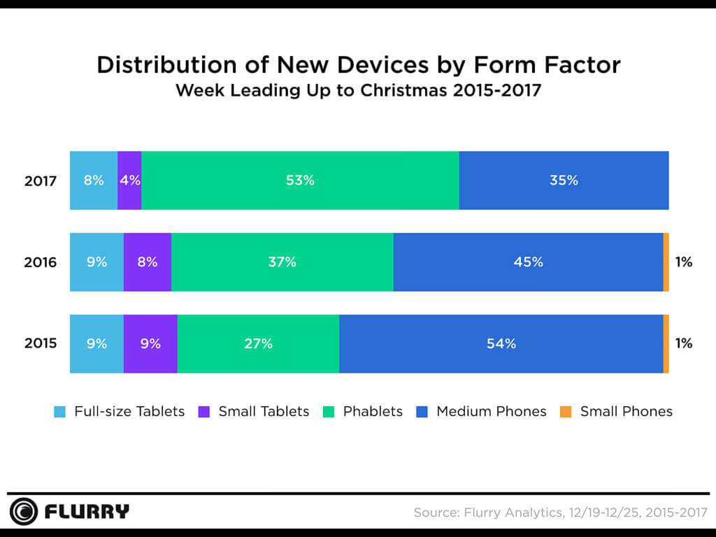 Obige Statistik zeigt, dass ein Großteil der aktivierten Smartphones mittlerweile Phablets sind, was durch die Konzentration der großen Hersteller auf den Premium-Markt keine große Überraschung ist. Tablets mussten weiter Anteile einbüßen und kommen nur noch auf 12 Prozent statt 17 Prozent im Vorjahr und 18 im Jahr davor. „Small Phones“ sind nicht mehr messbar und kommen auf weniger als ein Prozent Anteil.