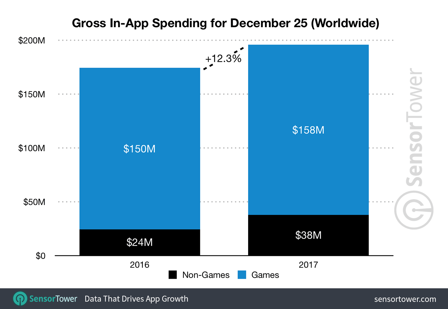 Dass sich mit Apps und Smartphone-Spielen sehr viel Geld verdienen lässt ist bekannt, aber wie groß die Summen tatsächlich sind, ist doch immer wieder beeindruckend. Die Marktforscher von SensorTower haben nun die Zahlen für den 1. Weihnachtstag dieses Jahrs ausgewertet und kommen auf eine Summe von fast 200 Millionen Dollar. Zum besseren Verständnis rechne ich die Zahlen im Artikel in Euro um, da sie ohnehin weltweit in verschiedenen Währungen erhoben worden sind.