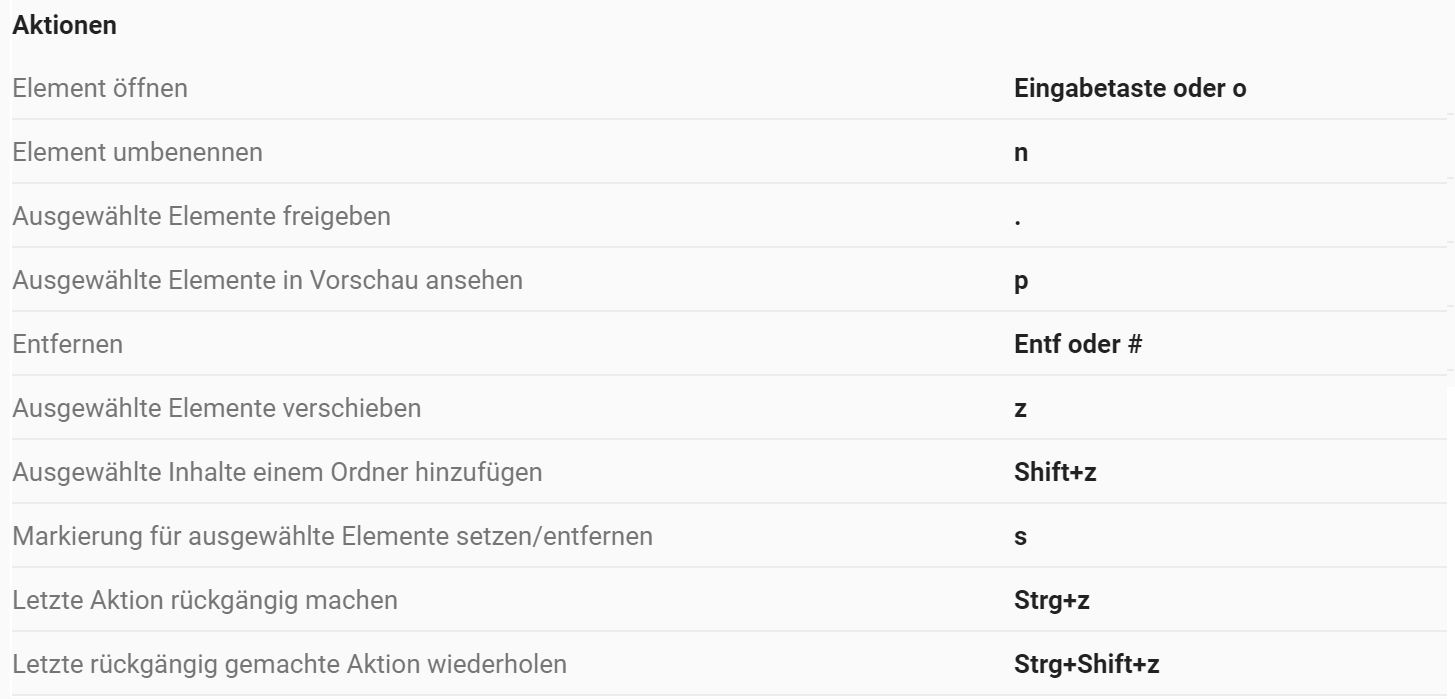 Und zu guter letzt lassen sich auch Aktionen auf das aktuell ausgewählte oder alle markierten Elemente anwenden. So lassen sich diese etwa direkt öffnen, umbenennen oder auch zum Teilen freigeben. Offenbar sind den Entwicklern dabei aber auch schon die Tastenkürzel ausgegangen, da ich mir die Buchstaben und Zeichen beim besten Willen nicht herleiten kann – zumindest nicht alle. Das Öffnen per ENTER und Löschen per ENTF kann man sich aber natürlich auch ohne langes Studium der Liste merken 😉