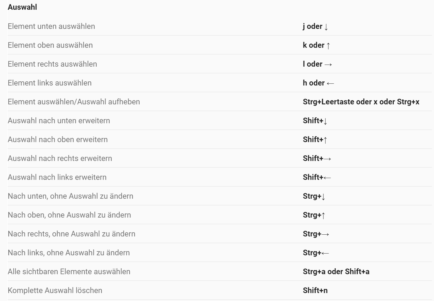 Beginnen wir mit der Auswahl von Dateien und Ordnern in der Übersicht: Dafür kommen glücklicherweise die aus vielen anderen Apps und Plattformen bekannten Kombinationen mit der SHIFT-Taste, der STRG-Taste und natürlich auch den Pfeiltasten zum Einsatz. Tatsächlich lassen sich die Pfeile für die einfache Navigation noch durch Buchstaben ersetzen, aber das führt (zumindest für mich) dann doch zu weit.