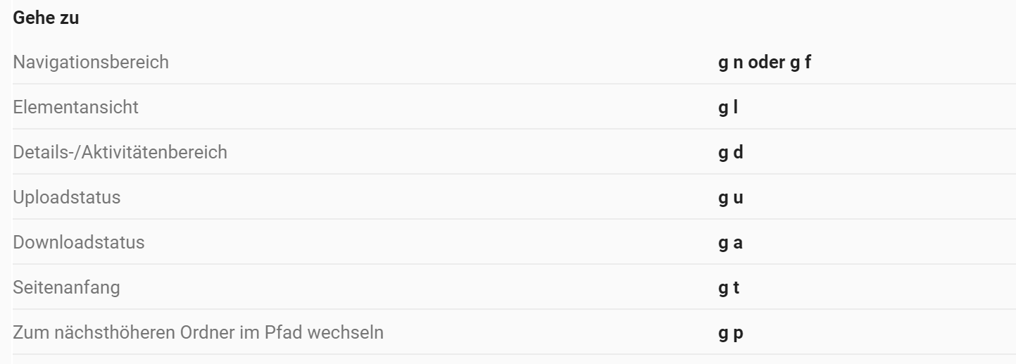 Um von einem Bereich zum anderen zu wechseln, kommt der Buchstabe „g“ gefolgt von einem weiteren Buchstaben zum Einsatz. Das „g“ kann man als „go to“ interpretieren und ist so schon einmal leicht im Kopf. Auch alle anderen Buchstaben kann man sich durch die englische Bezeichnung merken, wobei nur „a“ für Download etwas ungewöhnlich ist, aber das „d“ war bereits für die Details besetzt. Alternativ kann man auch mit der Tab-Taste zwischen allen Elementen wechseln.