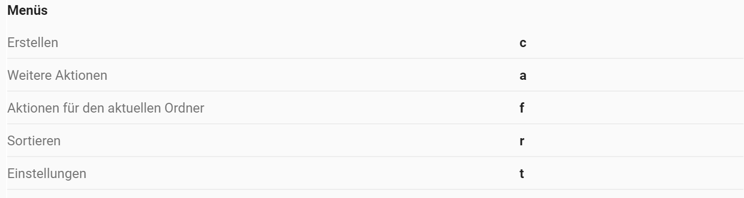 Die einzelnen Bereiche der Oberfläche lassen sich per Tastatur umschalten bzw. einblenden und ausblenden: So kann man in der Sidebar zwischen den Details und Aktivitäten umschalten, die Ordner-Ansicht ändern oder auch die Größe und Zeilenabstände festlegen. Mit der Slash (/) kommt man direkt in das Suchfeld – und auch dieses Kürzel ist produktübergreifend und funktioniert bei nahezu allen Google-Angeboten im Web.
