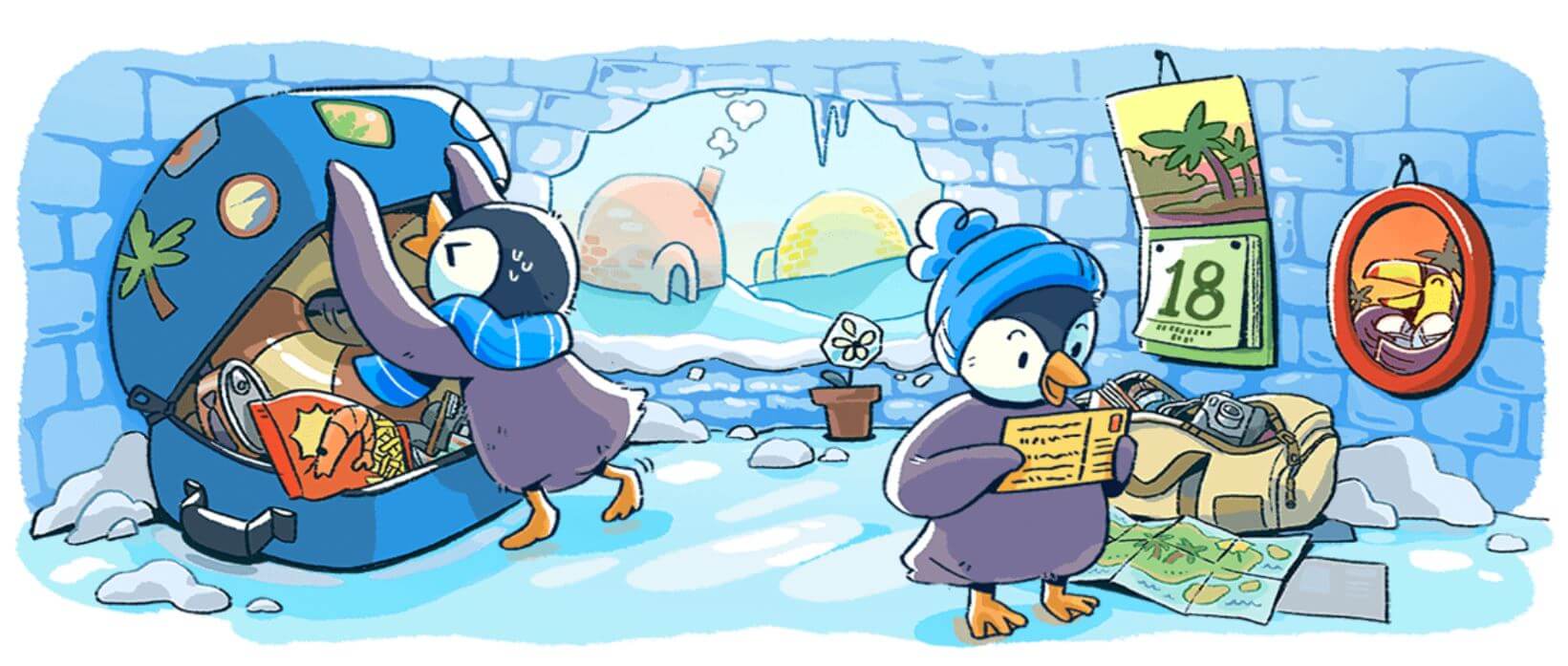 Zum Beginn der Doodle-Serie setzt Google in diesem Jahr auf eine kleine Slideshow, die aus drei einzelnen Bildern besteht und eine kurze Geschichte erzählt: In diesem Jahr möchten die Pinguine Weihnachten offenbar in der Karibik verbringen und rufen dazu ihren gefiederten Freund an, der mich an einen Tukan erinnert. Im nächsten Slide packen sie die Koffer, das Datum zeigt den 18. Dezember, und planen die finale Reise. Im letzten Slide ist dann schon ein Familienbild zu sehen, inklusive Geschenke für den 18., 25. und 31. Dezember sowie zum 1. Januar.