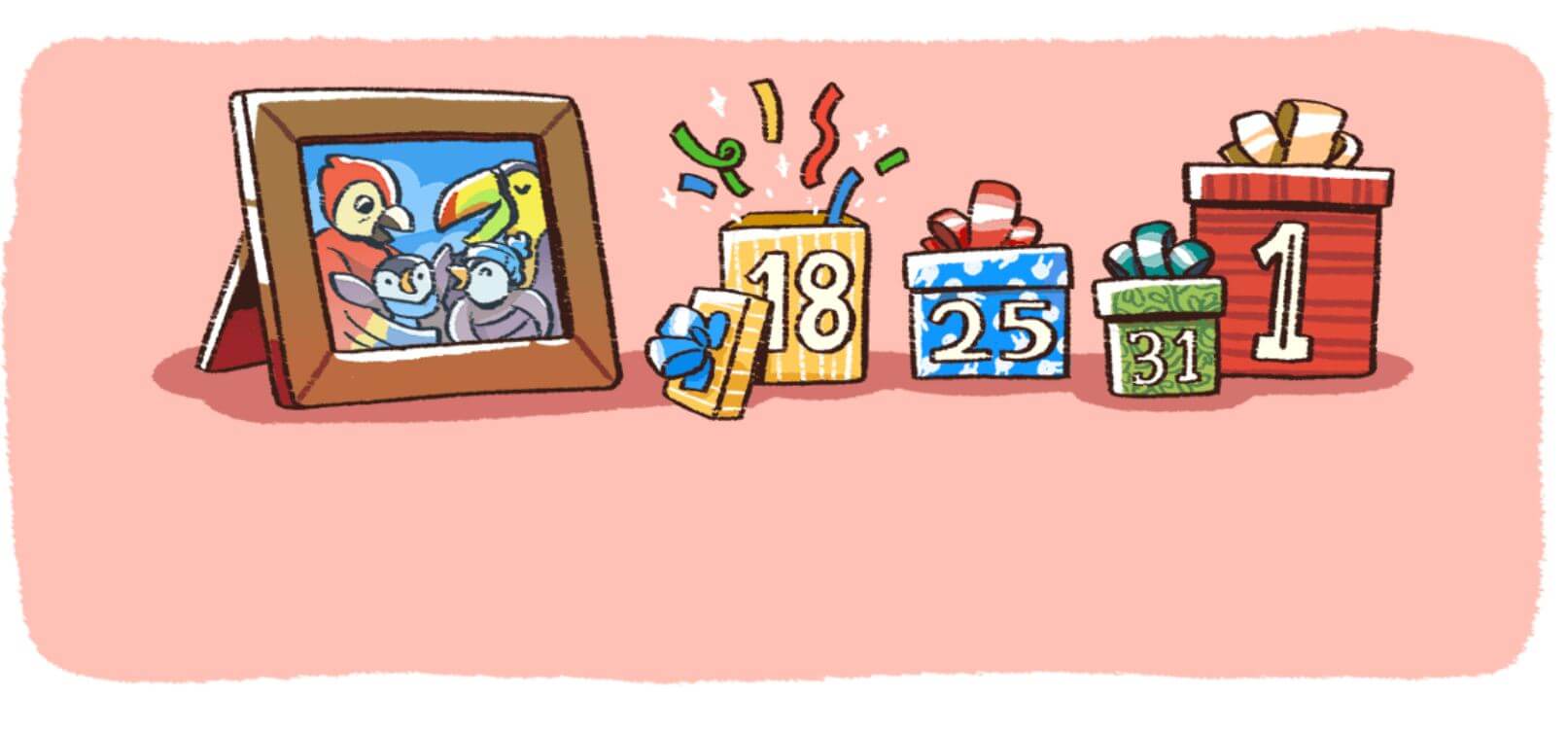 Zu Weihnachten bzw. der ganzen Vorweihnachtszeit muss ich wohl nicht viel sagen. Da Google keine religiösen Feste feiert, gibt es in den Doodles nie einen direkten Bezug zum klassischen und modernen Weihnachtsmann, sondern es wird lediglich immer vom „Fest“ geredet und man zeigt die Zusammenkunft von Familien bzw. die Feierlichkeiten. Das hält man vermutlich auch in diesem Jahr wieder so und setzt stattdessen auf die gefiederte Familie, die Geschenke austauscht und sich besucht.