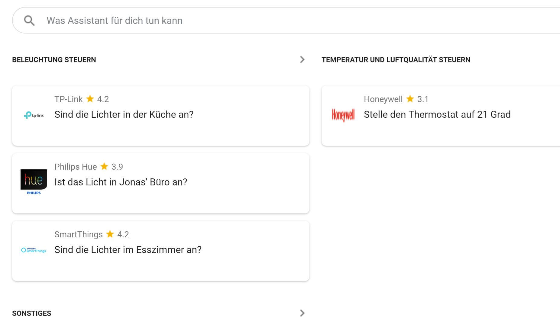 Im Explore-Bereich des Assistenten gibt es nun eine Auflistung aller verfügbaren „Actions“, die sowohl in Kategorien sortiert sind als auch durchsucht werden können. Zu jedem Eintrag steht eine Reihe von Beispielen zur Verfügung, sowie die Information, auf welchen Plattformen und Versionen diese Action nutzbar ist. Außerdem gibt es eine kurze Beschreibung und die Möglichkeit zum Teilen dieses Assistenten-Features. Im Grunde alles wie vorher, nur das es eben ein Verzeichnis statt nur einzelne Einträge gibt.